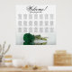 Enhance the aesthetic appeal of your wedding reception with this exquisite 21 table seating chart. The chart accommodates up to 210 guests and follows a traditional layout of 10 seats per table. The design exudes a romantic and stunning aura, showcasing a solitary deep emerald green coloured rose resting sideways and mirrored in a water body. The elegant calligraphic title reads "Welcome! Please find your" with ample space at the bottom for the couple's names and wedding date. This seating chart provides a delightful welcome to your guests while facilitating their seating arrangements.