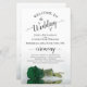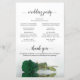 These wedding programs are elegant and tasteful, while still being budget friendly. The design features a single long-stemmed emerald green rose lying on its side, reflecting in a pool of water with waves and ripples. The typography features lacy black script calligraphy, and there is room for details on the ceremony, the bridal party, and a short thank you.