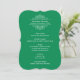 Elegant and formal wedding dinner menu cards feature a pop of colour with white reverse printing. Personalise with your event date and menu details. Display cards on guests' dinner plates or wrap them in napkins at every place setting for a stylish look. Emerald green background colour.