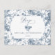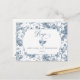 Elegant and ornate vintage blue and white toile de jouy pattern featuring exotic flowers, vines and foliage intertwined with garlands and baskets of roses. Includes a sculpted blank label with formal RSVP text graphic in a custom script font as well as editable text fields. The back features additional text fields with complementary floral embellishment. Shop matching products in Collections at the Grafixmom store.