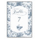 Elegant and ornate vintage blue and white toile de jouy background pattern featuring exotic flowers, vines and foliage intertwined with garlands and baskets of roses with custom sculpted label, elegant script text graphic, floral bouquet and editable text field for your table number. Shop matching products in Collections at the Grafixmom store.