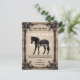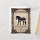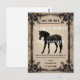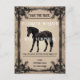 This wedding invitation design features a striking black horse gracefully poised against a warm beige background. Ornate floral and scrollwork patterns frame the image, adding a touch of sophistication and charm. The intricate border details in black and gold tones evoke timeless elegance, making it a perfect representation of love, strength, and beauty for a memorable wedding celebration.