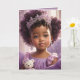 Features an enchanting illustration of an African American toddler. This adorable little girl, with sweet chubby cheeks and baby face, sports cute afro puff ponytails, sparkly diamond earrings, and a radiant diamond tiara. Dressed in a fancy purple tutu dress, she adds a touch of elegance and charm to any occasion. The darling princess holds a sweet teddy bear, enhancing the innocence and warmth of the design. Perfect for birthdays or any elegant celebration for a little girl, this greeting card captures the magic of childhood and the joy of special moments.