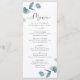 Simple Minimalist Eucalyptus Frame Script Wedding Dinner Reception 4 Course Meal Menu Cards. Perfect for your spring or summer garden or outdoor themed wedding theme. In a soft subtle muted colour palette of teal aqua greens, pastel mint, dusty blue greys, and simple classic white. The elegant script calligraphy font is a featured for the word Menu. This design is perfect for a farmhouse, country, or garden wedding. Simple Eucalyptus Menus are easy to customise with this template for your DIY and affordable wedding stationery.