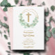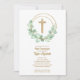 Elegant first communion invitations feature a gold faux glitter cross, a eucalyptus leaf wreath and your details in chic lettering on the front and gold dots on pink on the back. Perfect for your child's first communion, baptism or christening. MATCHING items available in our store.