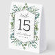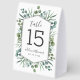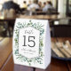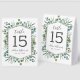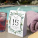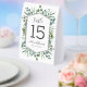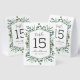 Elegant wedding table number cards feature modern organic style, combining a geometric hexagon frame with botanical green foliage and beautiful typography. Watercolor greenery includes eucalyptus, leaves, and silver dollar eucalyptus branches in soft verdant spring and summer shades of mint, green, olive, and muted blue green. The black text can be fully personalised with a monogram of the bride and groom's name and wedding date. Please note: each individual table number must be customised and added to your shopping cart, one quantity at a time.