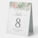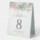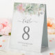 Beautiful wedding table numbers featuring blush pink floral watercolor eucalyptus and gold leaves.