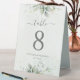 Beautiful wedding table numbers featuring watercolor eucalyptus and gold leaves.