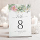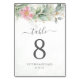 Beautiful wedding table numbers featuring pink floral watercolor eucalyptus and gold leaves.
