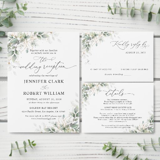 Elegant Eucalyptus Wedding Details Card features soft watercolor eucalyptus greenery paired with elegant gold accents, creating a refined and natural look. This enclosure card is perfect for sharing additional wedding details such as reception information, accommodation notes, directions, or special instructions for guests. Its delicate botanical style complements greenery or nature-inspired weddings and coordinates beautifully with matching invitation suites for a cohesive and elegant wedding stationery set.