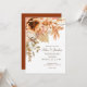 This modern and trendy Elegant Fall Floral Terracotta Wedding Invitation boasts a rustic charm that perfectly captures the essence of a fall wedding. The warm burnt orange terracotta botanical design is beautifully adorned with delicate watercolor flowers in shades of orange, yellow, blush, and white. The floral design is artfully arranged to create a romantic and whimsical feel that sets the tone for your special day. The text is elegantly written in a classic font, providing a timeless touch to the design. Your guests will be delighted to receive this invitation and will be impressed with the attention to detail and care that went into choosing it. With its charming boho-themed design and warm hues, this invitation is sure to evoke the cosy feelings of autumn and make your wedding day unforgettable. Order yours today and let the beauty of this invitation set the stage for a magical celebration!