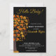 This elegant fall baby shower invitation is perfect for a modern autumn baby shower. The simple design features a tree and fall leaves with elegant white and yellow typography on a black background.