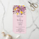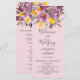 Elegant fall winter purple floral wedding program featuring a modern and elegant calligraphy the wedding of Script in purple, orange and yellow flowers with sage green foliage on pink