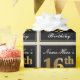 This simple and elegant wrapping paper design features a personalised message like "Name-Here’s 16th Birthday" (with the "16th" having a faux/imitation gold-like colouring look) within a black-coloured square area featuring a simple border outline. The name is in an elegant white-coloured script-like text, and can be personalised. Wrapping paper like this could perhaps be used when wrapping birthday gifts for somebody who is celebrating their sixteenth birthday. [~Z0000217]