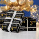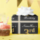 This simple and elegant wrapping paper design features a personalised message like "NameHere’s 3rd Birthday" (with the "3rd" having a faux/imitation gold-like colouring look) within a black-coloured square area featuring a simple border outline. The name is in an elegant white-coloured script-like text, and can be customised. Wrapping paper like this could perhaps be used when wrapping birthday gifts for somebody who is celebrating their third birthday. [~Z0000217]