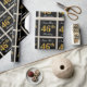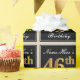This simple and elegant wrapping paper design features a personalised message like "Name-Here’s 46th Birthday" (with the "46th" having a faux/imitation gold-like colouring look) within a black-coloured square area featuring a simple border outline. The name is in an elegant white-coloured script-like text, and can be personalised. Wrapping paper like this could perhaps be used when wrapping birthday gifts for somebody who is celebrating their forty sixth birthday. [~Z0000217]