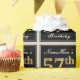 This simple and elegant wrapping paper design features a personalised message like "NameHere’s 57th Birthday" (with the "57th" having a faux/imitation gold-like colouring look) within a black-coloured square area featuring a simple border outline. The name is in an elegant white-coloured script-like text, and can be personalised. Wrapping paper like this could perhaps be used when wrapping birthday gifts for somebody who is celebrating their fifty seventh birthday. [~Z0000217]