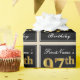 This simple and elegant wrapping paper design features a personalised message like "FirstName’s 97th Birthday" (with the "97th" having a faux/imitation gold-like colouring look) within a black-coloured square area featuring a simple border outline. The name is in an elegant white-coloured script-like text, and can be personalised. Wrapping paper like this could perhaps be used when wrapping birthday gifts for somebody who is celebrating their ninety seventh birthday. [~Z0000217]