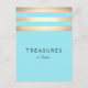 Elegant, stylish vertical business card design featuring three horizontal gold FAUX foil stripes on aqua blue background.