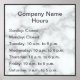 This elegant faux marble poster has dark grey display text that you can edit to show the correct information. At the top, there's a line of large grey display text you can replace with your company name. The next line says "Hours" (you may edit hours if desired). Under the two lines of large grey text, there are seven lines of smaller grey text for each day of the week. You can change the hours for each day, if necessary.
