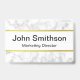 This white marble name badge has black text and a faux gold line above and below the text. Personalise it with your text such as name and title.