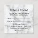 This faux white marble referral card has black display text you can edit. There is text to share the terms for the referral, the name of the friend and the referrer, business name, and contact information. All text can be edited. The other side of the card has a display image you can replace with the correct logo.
