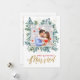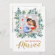 A modern, romantic first Christmas married holidays card template with a winter foliage theme, featuring a whimsical square botanical frame of pine branches, silver eucalyptus and gold myrtle branches (this is a digital effect) over the photo template on the front and gold foil over the word "married" (this is a digital effect, not real foil). Template for a second wedding photo on the back. A perfect newlyweds holidays and Christmas photo card that is elegant and classy.