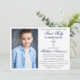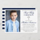Modern Elegant Blue and Silver First Holy Communion Invitation with Cross and Photo. Blue and White Stripes on Back.
