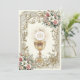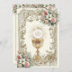 Celebrating the Sacrament of First Holy Communion is a wondrous occasion. This traditional Catholic custom-designed vintage First Holy Communion Invitation features a beautiful image of the Chalice and Host, the Eucharist overlaid on an ornate gold frame, accented with white lilies and pink roses. All text and fonts can be easily modified.