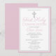 Celebrate this special milestone with a beautifully modern First Holy Communion invitation. This design features a simple silver cross against a white background with a pink border. Design the perfect girl's First Communion invitation by customising the colour, font, date, and all text details.