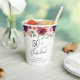 Elegant paper cups for her 50th birthday party featuring "50 & Fabulous" in a stylish script and watercolor bouquets of burgundy red, blush pink and purple florals with sage greenery. Easily personalise with her name and the party date.