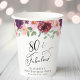 Elegant paper cups for her 80th birthday party that feature "80 & Fabulous" in a stylish script and watercolor bouquets of burgundy red, blush pink and purple florals with sage greenery.