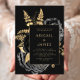This elegant wedding invitation features a lush, romantic floral bouquet in black with gold faux foil and glitter foliage on a black background. Customise the gold-coloured text in stylish fonts on a black rectangle. The back of the card is solid black.