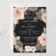 "Elegant Floral Black Rose Gold Eucalyptus Leaf Blush Pink Wedding Invitation Suite." Painterly modern style flowers were painted in pale blush pink and muted earth tones with hand drawn leaf foliage elements rendered in rose gold glitter. A dusty sage eucalyptus leaf foliage wreath was hand painted in watercolor by internationally licensed artist and designer, Audrey Jeanne Roberts. The reverse side has black background with the same wreath and the couple's monogram initials and wedding date. Copyright.