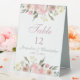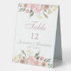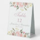 An elegant spring floral bouquet of blush pink peonies and ivory roses frame the top and bottom of this lovely spring wedding table number table tent sign. The sprigs of sage leaves decorate in the midst of the peach array of flowers that surround the beautiful modern typography.