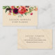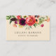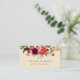 Elegant watercolor bohemian style flowers, feathers and foliage in chic shades of purple, burgundy, pink, peach and green with gold geometric accents on back, business cards. Background colour, shown in champagne, can be customised.