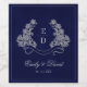 This design features navy blue heritage crest, delicate monogram initials, elegant script typography, a subtle luxury linen texture, with a detailed botanical leaf engraving pattern in silver color. Perfect for classic, royal-themed, old-money, and formal black-tie weddings. This product can be easily personalized. If you need help with the customization of the product or need matching products kindly please contact me via Zazzle.
