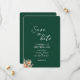 Dark green 'save the date' for weddings, with watercolor apricot flowers and garden foliage. A simple yet elegant contemporary botanical design inspired by boho vintage style, with monogram on the back.