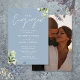 This elegant dusty blue greenery floral engagement party invitation can be personalised with your information in chic typography with your photo on the reverse. Designed by Thisisnotme©