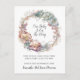 An elegant pregnancy announcement with delicate watercolor floral frame wreath and a modern trendy script typeface. Pretty soft colours in pale pinks, blues and greens.