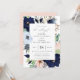 Watercolor flowers and foliage in trendy shades of navy, blush, dusty blue and taupe, elegant wedding invitation. Card features solid petal pink colour backing.