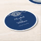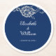 Elegant Floral Lace on Navy Blue Wedding Round Paper Coaster