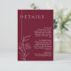 This chic wedding details card features modern floral artwork on a deep burgundy background. The clean white typography creates a clear and stylish layout that is easy for guests to read. There is space to share important information such as directions, accommodations, dress code, or reception details. The design pairs well with formal, romantic, fall, and winter wedding themes and completes a coordinated burgundy invitation suite.