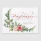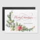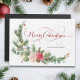 Lovely winter watercolor style floral border cluster featuring pink roses, pine cones, fir branches, holly & eucalyptus with elegant red Merry Christmas greeting in handwritten calligraphy font with flourishes, with text field for personalisation.
