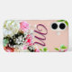 Design features a champagne-pink background to the image of a bouquet of beautiful pink and white flowers surrounding the monogram you supply in an elegant burgundy font.
