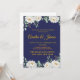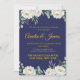 Beautiful wedding invitation featuring white flowers and gold text on a navy blue background. Perfect for elegant and modern weddings