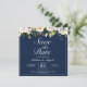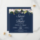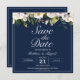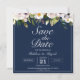 Elegant wedding save the date with white flowers and a navy blue background. Personalise it with a QR code on the back that your guests can scan to easily open your wedding website.