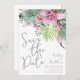 A tropical design that embraces the tranquil beauty of nature mixed with a playful edge that is sure to help you have fun. A blend of calming green tropical leaves, including banana leaves, palms, monstera leaves, and pink princessa plants, alongside soothing purple-pink orchid flowers and protea bloom, intertwined with various other foliage. Enhanced by a modern handwritten font, this enchanting print radiates charm and sophistication. This versatile design brings a sense of tropical paradise to any setting or special occasion, making it perfect for a destination wedding, or just when you want to add a tropical flare. Fun Modern Floral Palm Leaves Tropical Wedding Save the Date