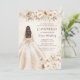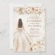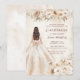 This is a beautiful quinceañera invitation design, perfect for celebrating the special milestone of a young girl's 15th birthday. The invitation features an elegant illustration of a young woman in a stunning ballgown, adorned with glittering accents and a graceful bow at the back, symbolising the grandeur of the occasion. The soft, neutral colour palette of champagne and cream, complemented by delicate floral arrangements and shimmering butterflies, adds a touch of sophistication and charm.