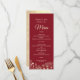 Elegant, modern red wedding menu with modern calligraphy script and gold floral lace.